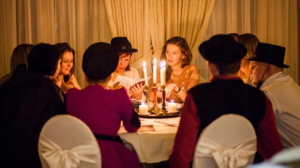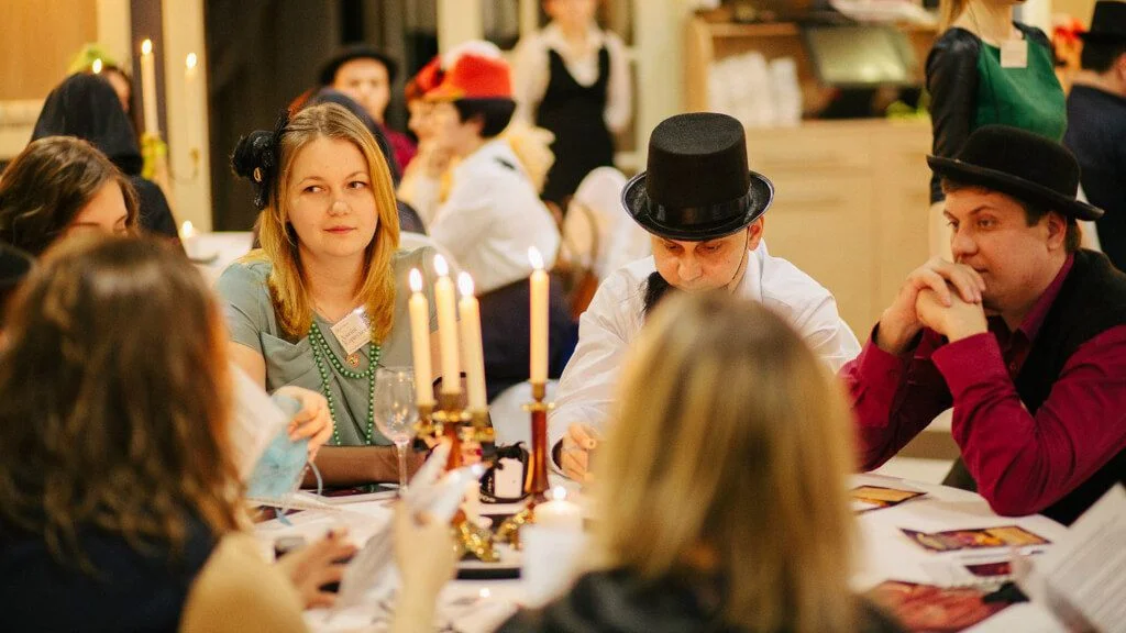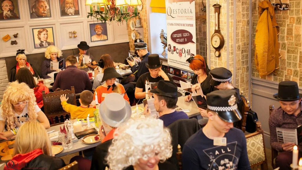 Обычно наши квестории рассчитаны минимум на 2,5-3 часа игры. Игроки перемещаются по помещению, бурно общаются и активно участвуют в необычной истории.